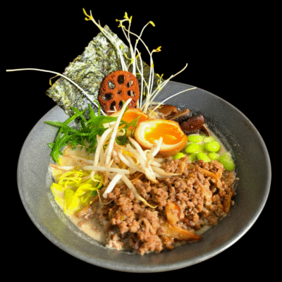 Tradycyjna azjatycka zupa na bazie wolnogotowanego wywaru mięsnego podawanego z szarpaną wieprzowiną, swojskim makaronem ramen oraz dodatkami (jako, nori, grzyby shitake, naruto maki, sezam, szczypiorek)